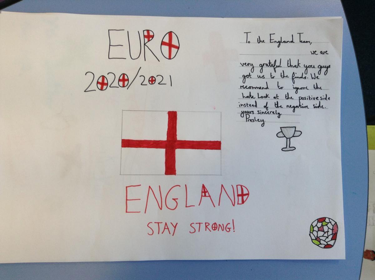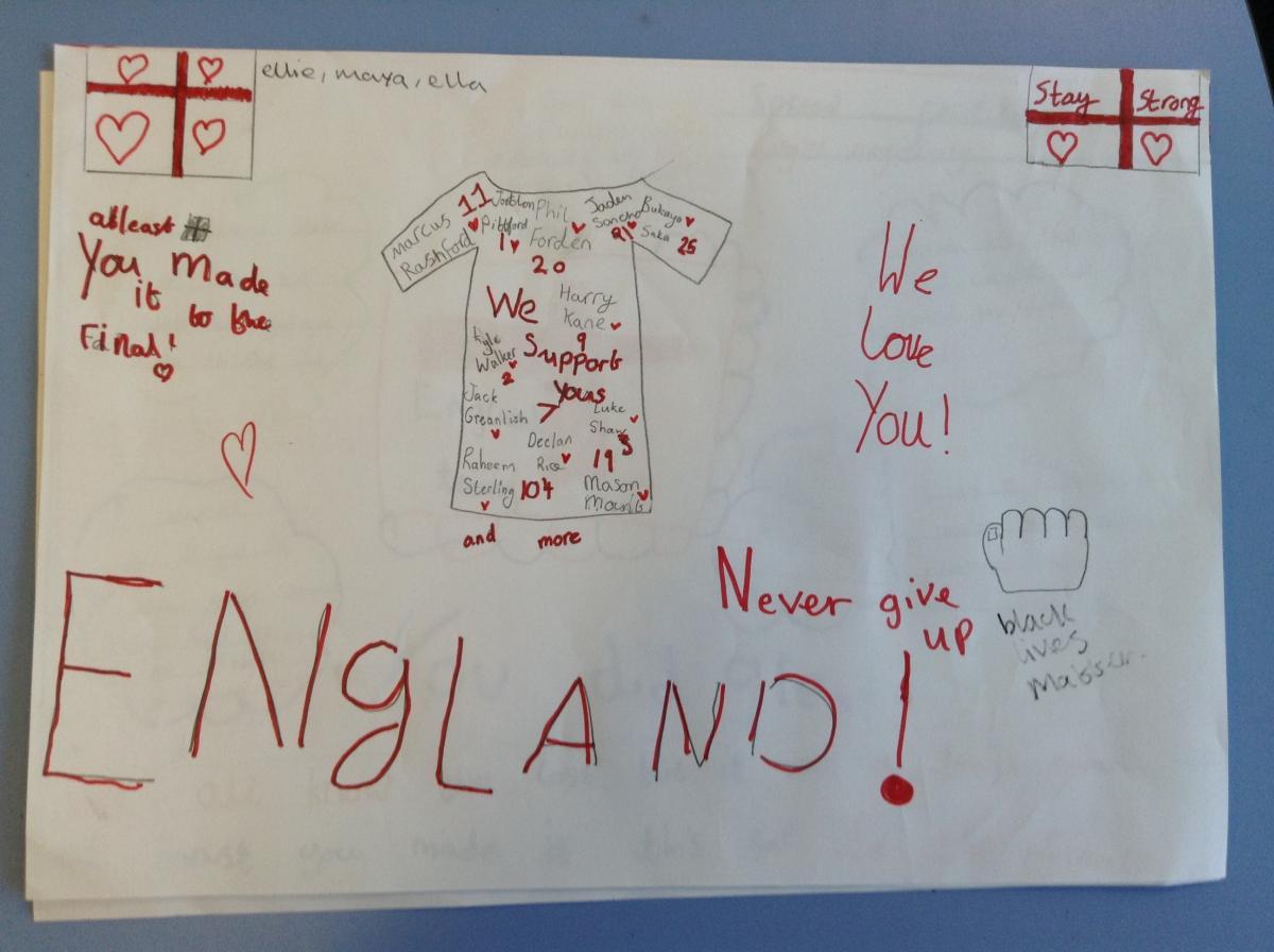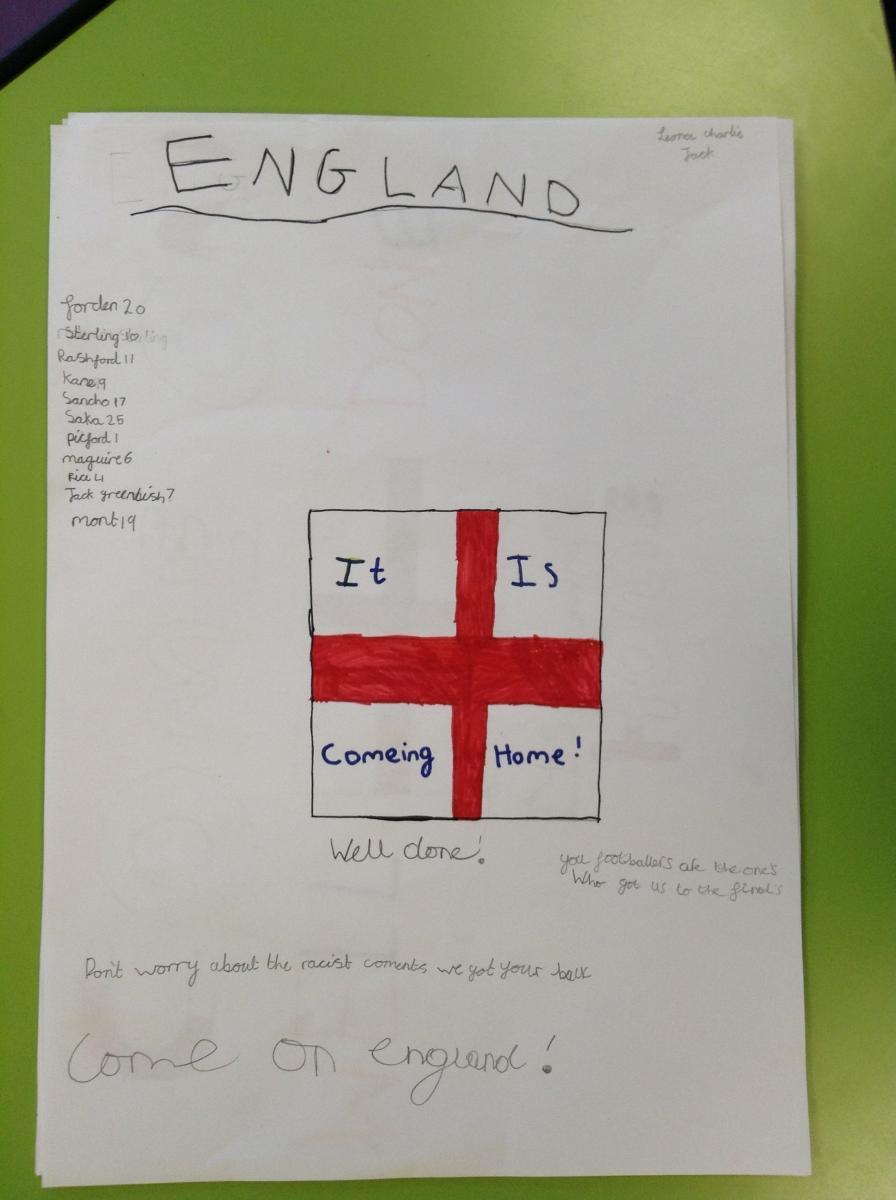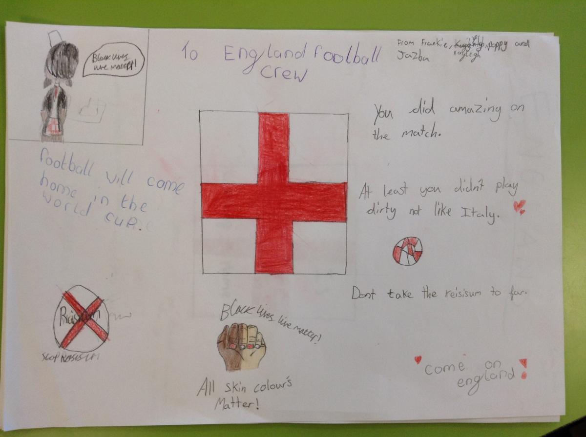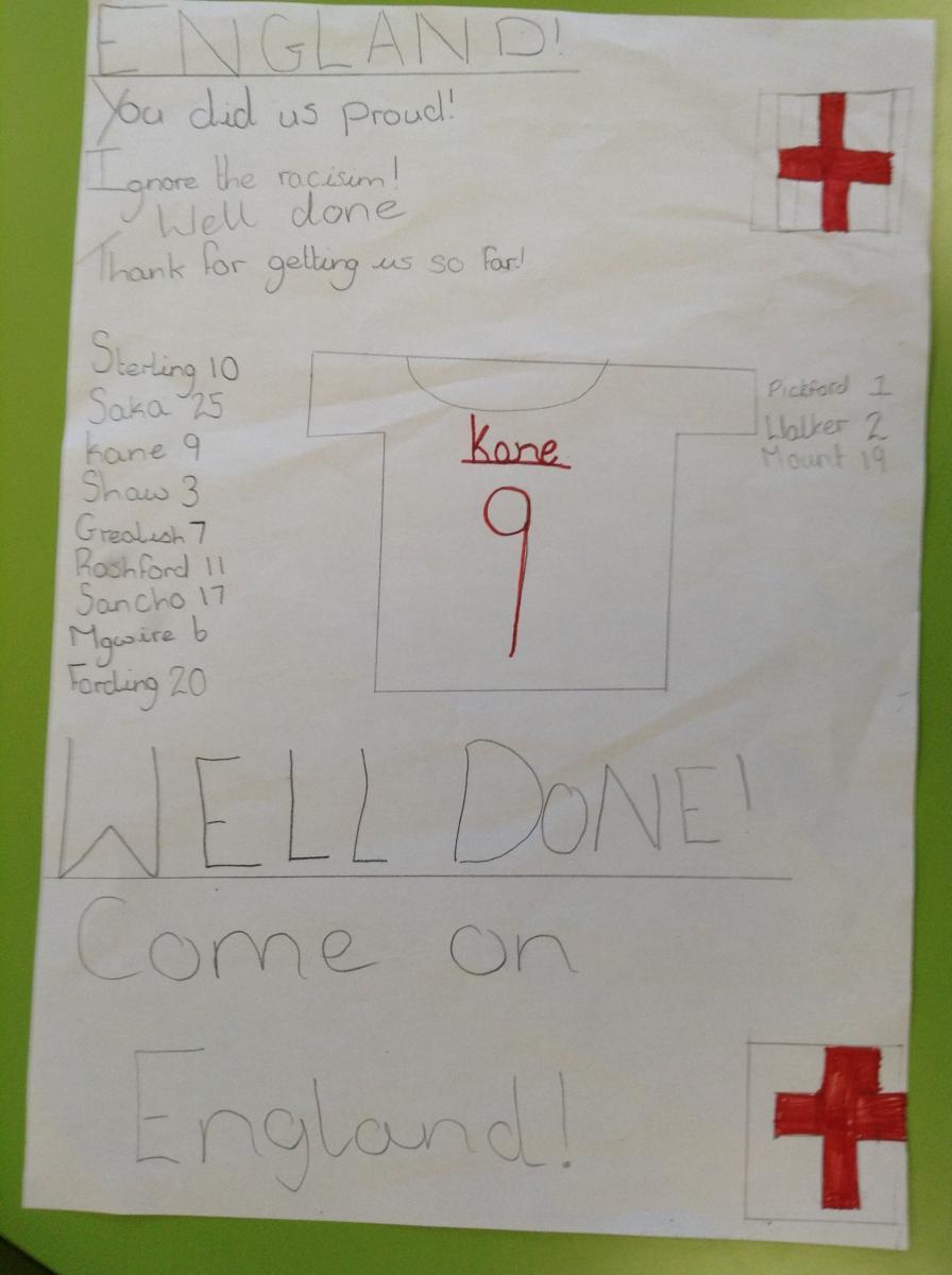 Following England's narrow defeat in the Euros, the children wanted to show their appreciation of the players and to celebrate all the happy memories they have given us over the last month. The children have written letters, made posters and recorded videos messages to show their love and support for the players who have received racist abuse online following the match.