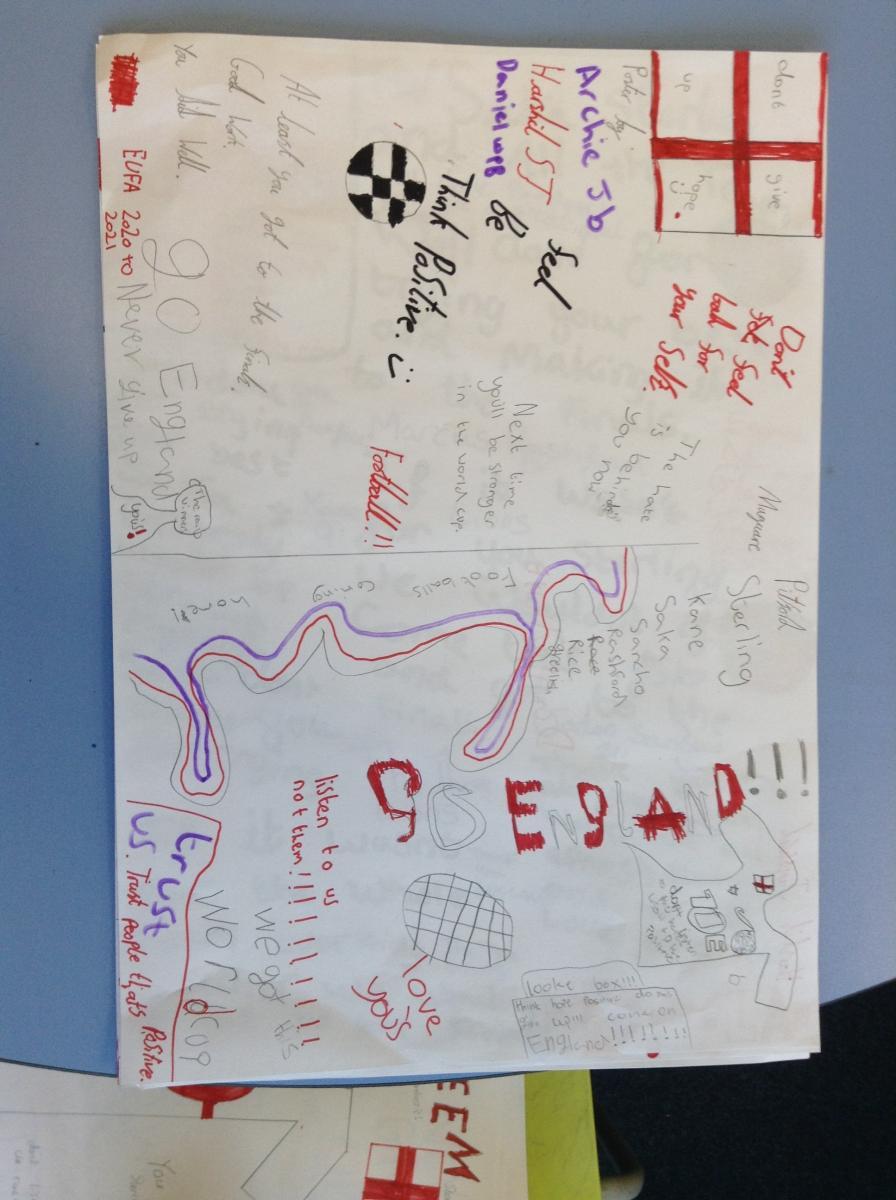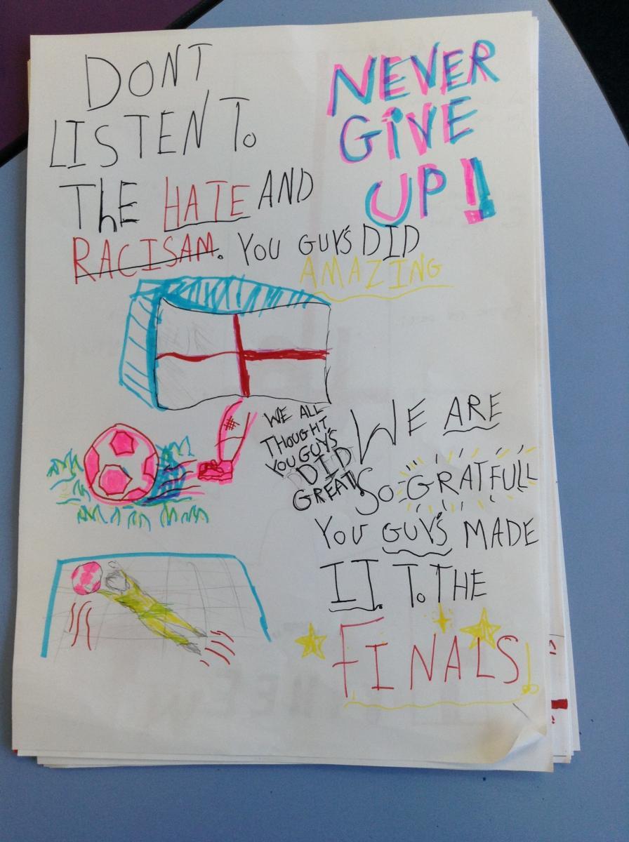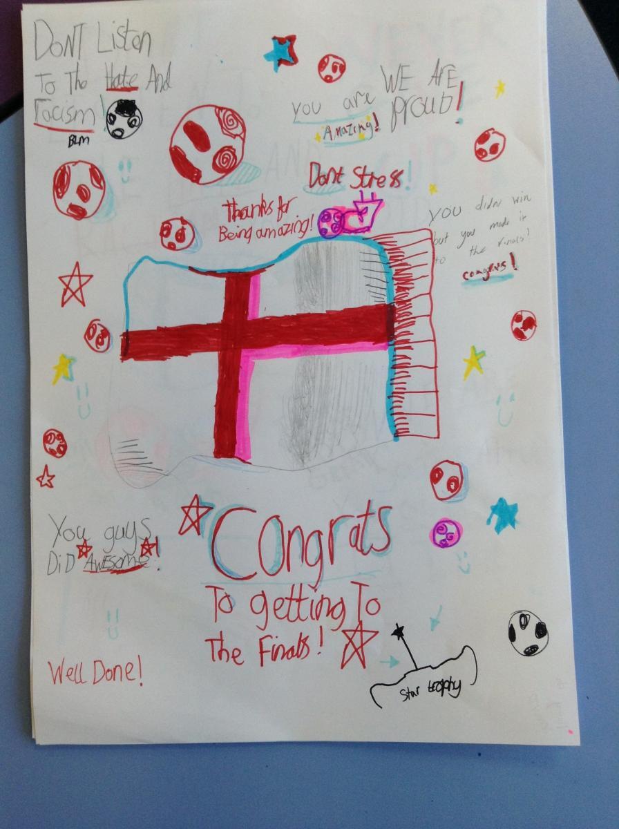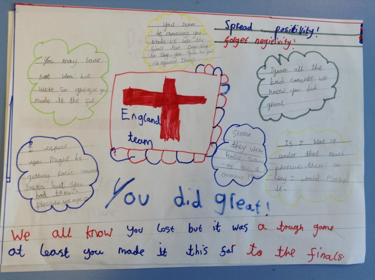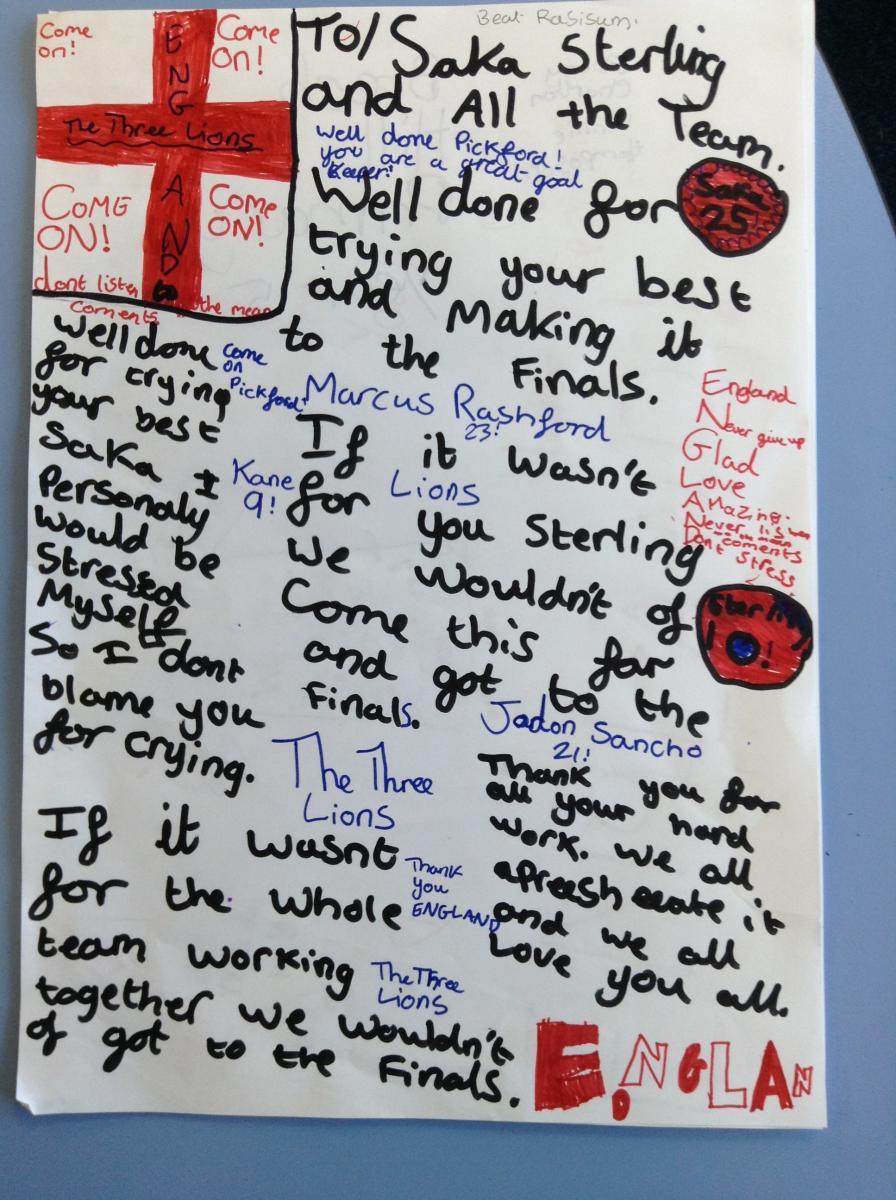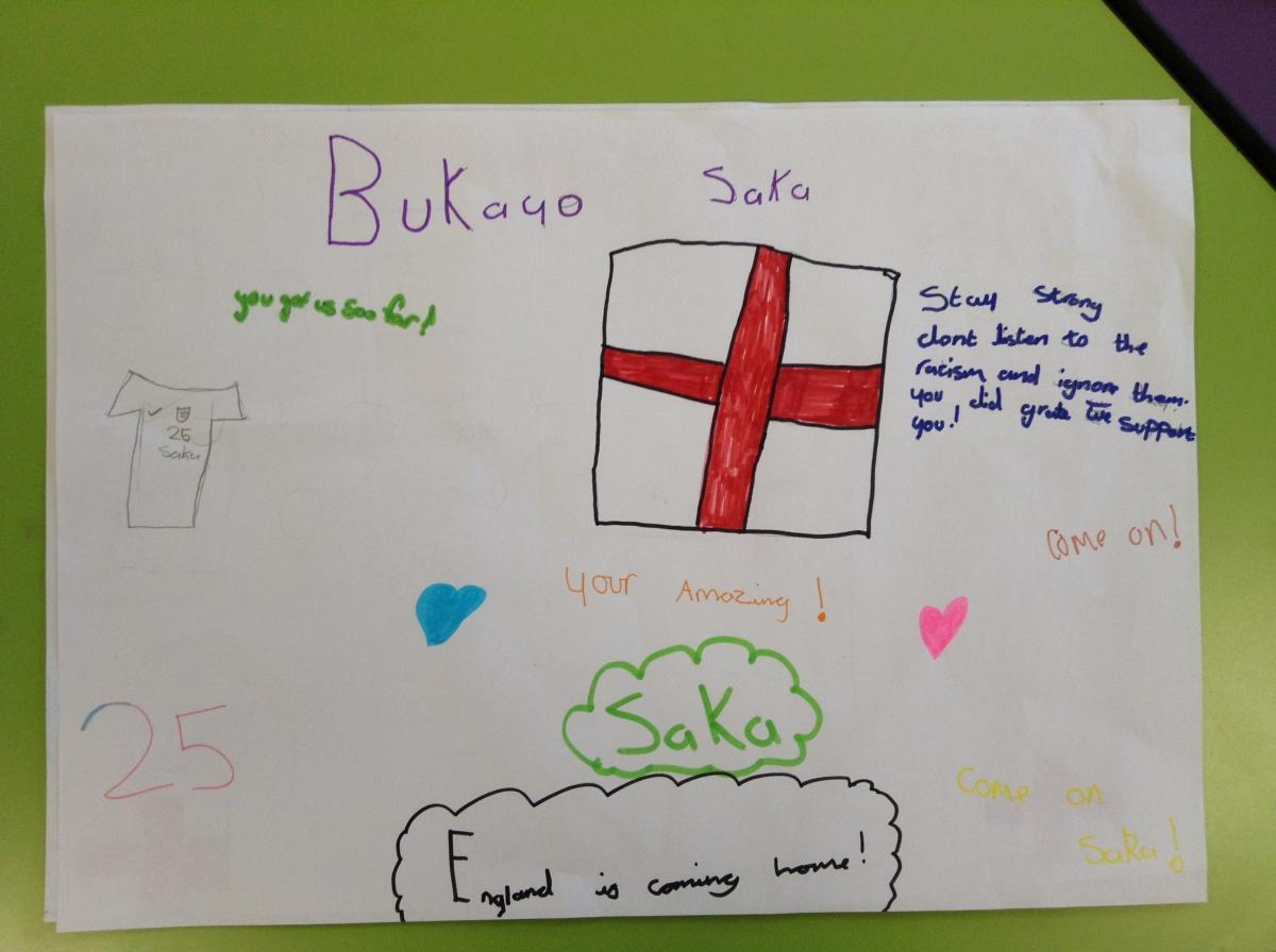 Following England's narrow defeat in the Euros, the children wanted to show their appreciation of the players and to celebrate all the happy memories they have given us over the last month. The children have written letters, made posters and recorded videos messages to show their love and support for the players who have received racist abuse online following the match.